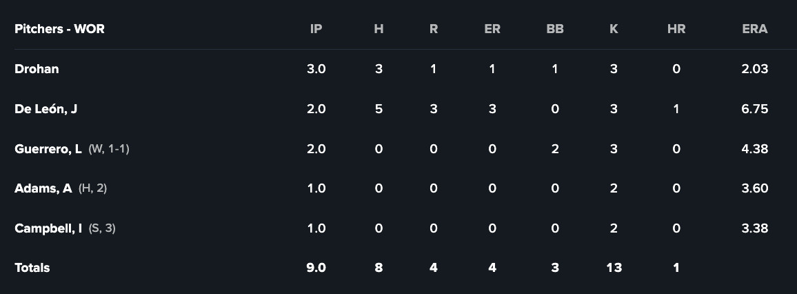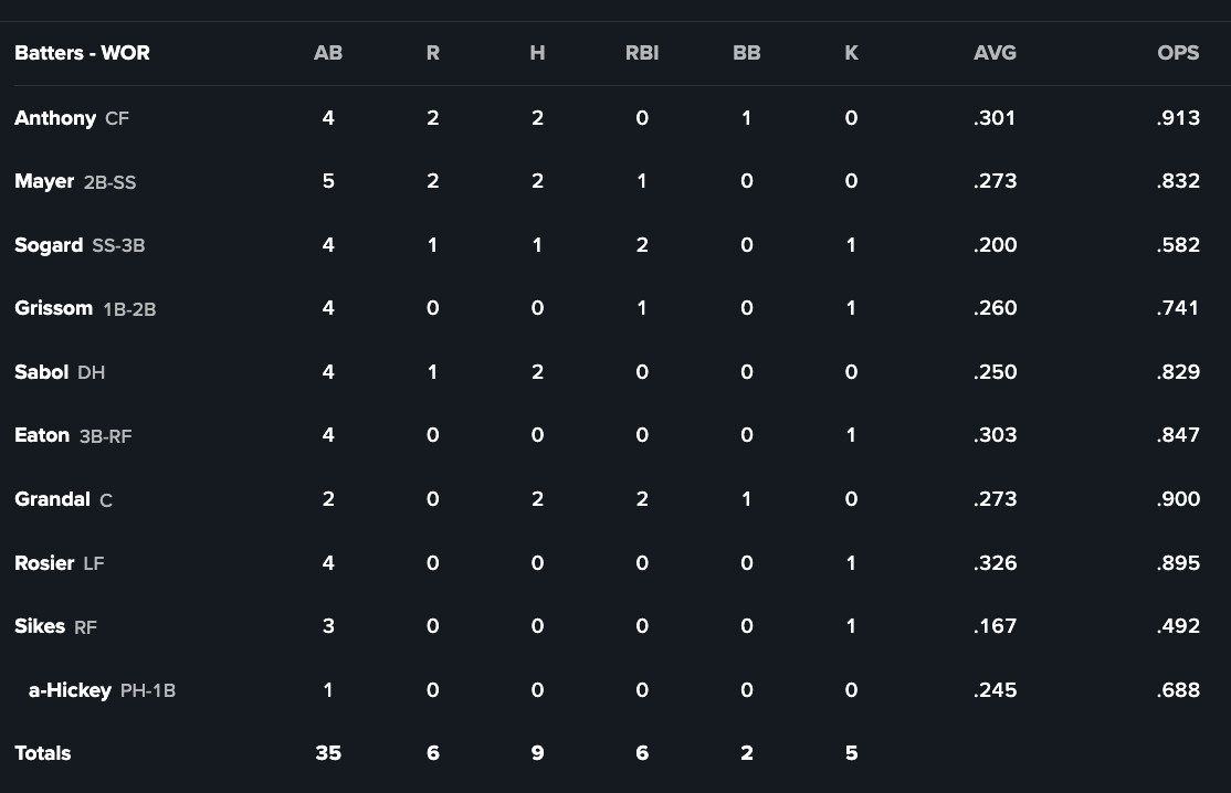 Shane Drohan didn’t get far in this one in Lehigh Valley (Phillies AAA), and did not leave due to injury, which makes my spidey senses tingle there may be a change in Boston’s bullpen soon, but had a nice showing regardless, allowing one run in three innings. Most of the bullpen also gave the team a puncher’s chance in the eighth inning, and punch they did. Here’s the sequence that made a 4-2 game a 4-4 game: Roman Anthony walk, Marcelo Mayer long double, Nick Sogard line drive single to score Anthony, Vaughn Grissom scoring Mayer with a sac fly. Yasmani Grandal, who was hurt by being hit by a pitch earlier but stayed in the game, would then bring it home with a 2-RBI double in almost the same spot Mayer put the ball. This is the type of advancing runners you don’t see from the Boston squad most nights, and so it’s nice to see from the top of the Worcester lineup made of names that are clearly speculated to have some playing time up in the bigs in short order.