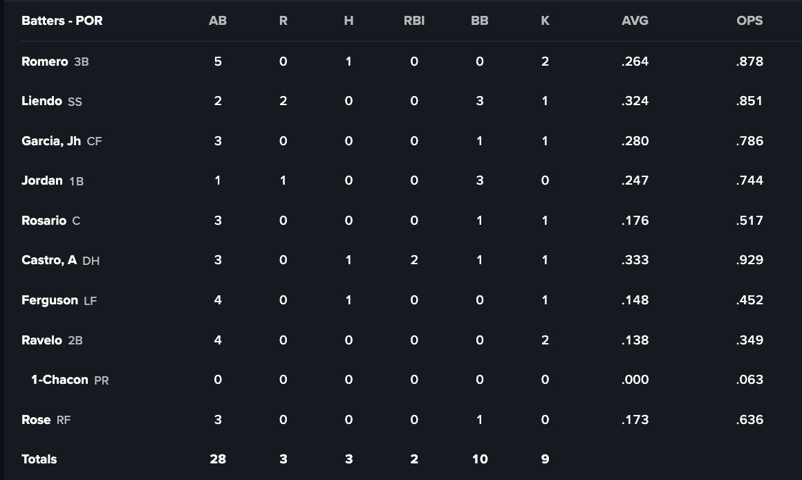 Did you know the Bowie BaySox (Orioles AA) renamed themselves the Chesapeake BaySox? It just doesn’t have the same ring. Speaking of not having a ring, the Sea Dogs bats again stayed dry, managing just three hits. They stayed patient, working ten walks on the eight-inning contest, including three in the third inning when Allen Castro doubled to score Ahbram Liendo and Blaze Jordan to make this a 3-0 game. For what it’s worth, Liendo, who played short Wednesday, drew three walks. Who knows how long that fateful third inning would have gone had Ronald Rosario not been caught up at home; the game certainly may not have gone to extras. Otherwise, with not many hits to drive them in, especially late, the team fell.