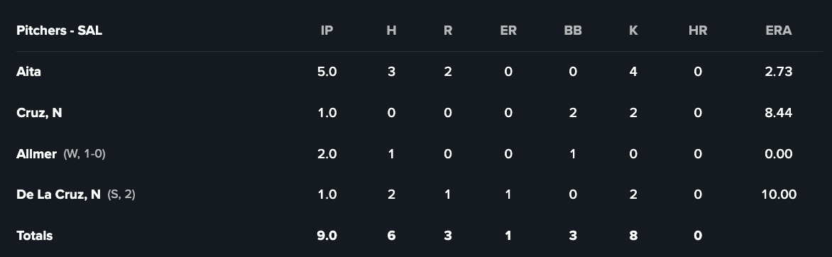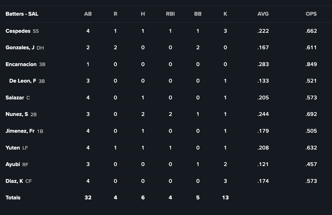 Yoelin Cespedes bounced back from a fluky Tuesday: just when it appeared that he was going to get another golden sombrero, he channeled some late heroics with an eighth-inning solo shot to put the team ahead of Fayetteville (Astros A), 3-2. The play had a .253 WPA and brought the contest from exactly a 50/50 coin flip to a 75.3% winning percentage, and Salem never looked back, though they did benefit tremendously from a Starlyn Nunez single later in that inning to plate Justin Gonzales. Fun night when teams go 4-2 overall!