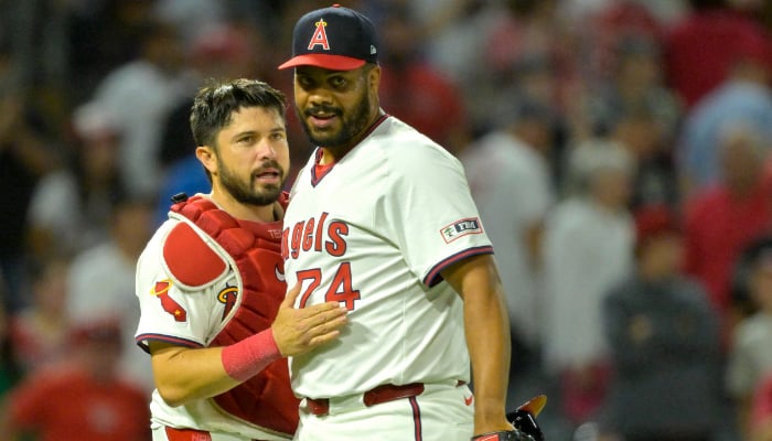 Los Angeles Angels Kenley Jansen (left) is congratulated by Travis d’Arnaud after his 16th save of the season against the Texas Rangers at Angel Stadium in Anaheim on July 9, 2025. — Reuters