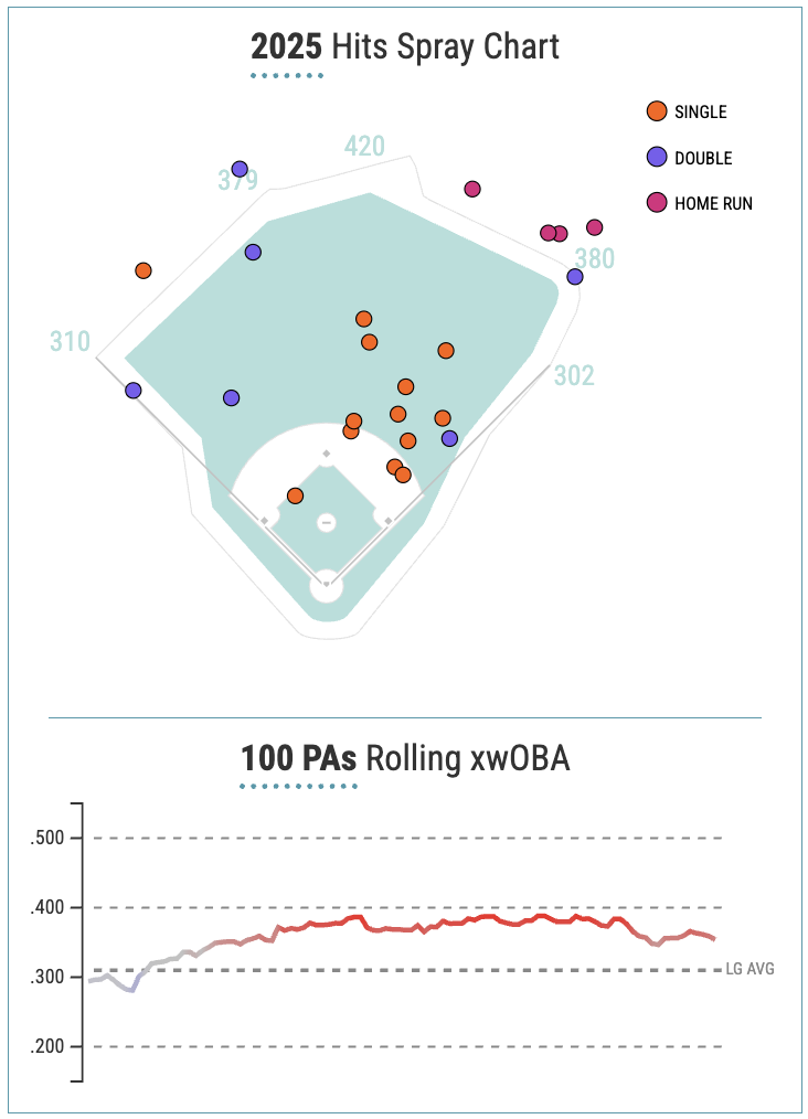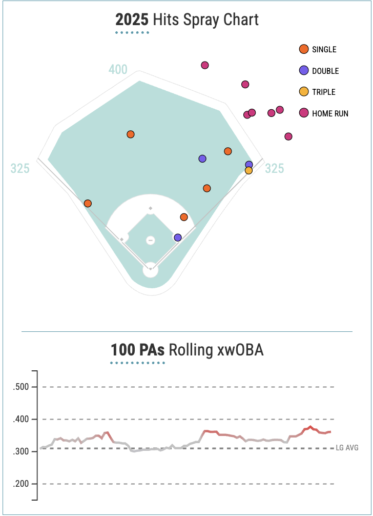 Abbott has allowed a 1.64 HR/9 and a 57.1 percent FB this season. The FB percent in this park is extremely scary, and to add insult to injury, the Reds’ bullpen has not been much better. They have a 1.51 HR/9 and a 48.3 percent FB this season. With Abbott, we want to attack him with right-handed hitters. He had a 1.9 HR/9, 52.4 percent FB, and a 28.8 percent Hard Hit in 2024. In 2025, he has a 1.0 HR/9, 60.0 percent FB, and a 26.7 percent Hard Hit.