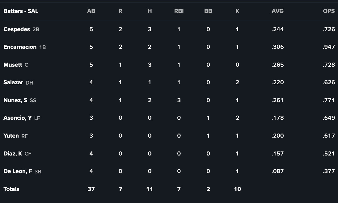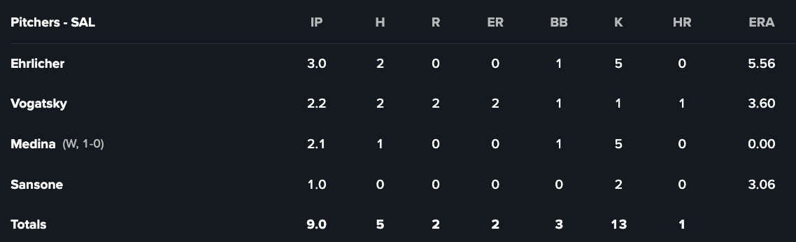 19 year-old Andrew Mussett, also a catcher, caught the “catchers raking” bug, but truthfully, he had it earlier in the month: he’s slashing .273/.407/.591 since May 1 after securing three hits Saturday. Yoelin Cespedes also hit his second home run in three days leading off Salem against the Astros’ A squad. Manuel Medina, struck five of the nine batters he faced out, giving up kust one hit and a walk in his seven outs of work in a strong relief showing that allowed Salem to pull ahead via Freili Encarnacion’s seventh home run of the young season and then stay ahead.
