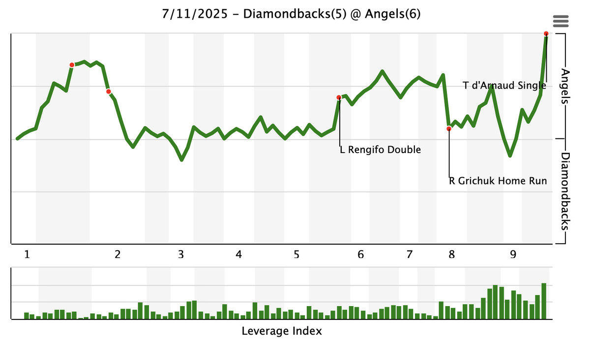 With the bullpen being what it is right now, our defense needs to be top shelf to soak up as many extra outs as possible. Alek Thomas, whose defense in the part of the year was not up to his usual Gold Glove standard, made another spectacular play to get the first out for Tony Disco in the 7th. Logan O’Hoppe smoked a line drive (112 mph!) to Alek’s glove side in center. Alek reacted quickly and was able to snag the sinking liner on a slide.