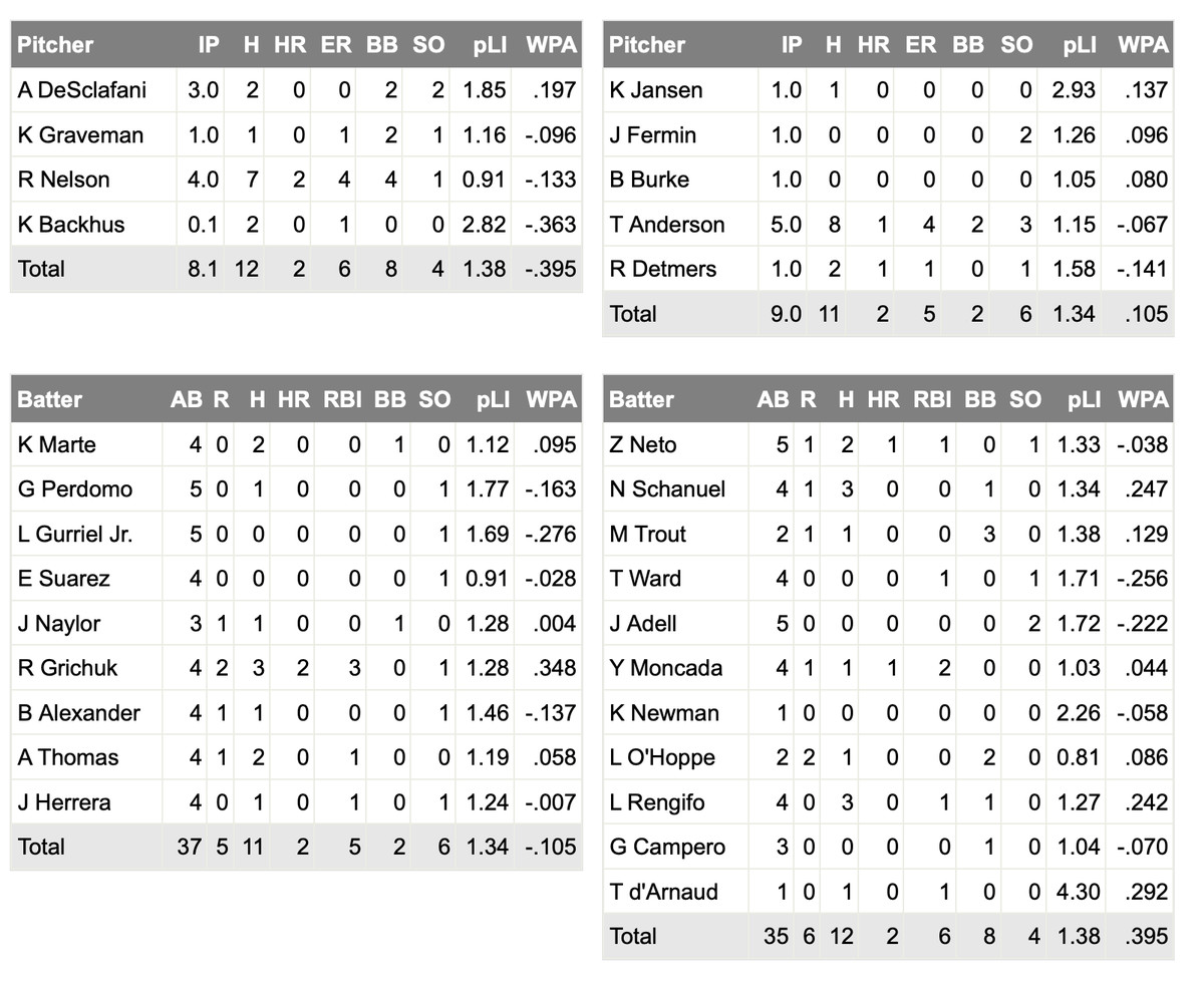 Zack Neto, the Angels’ lead-off man, reached first base to start off the 4th inning on a bleater into short right field. When it was hit, I thought it would probably be caught, but then I was reminded that it wasn’t Corbin in RF tonight. The ball ended up dropping a few feet in front of Randal Grichuk. Fortunately, Ryne was able to relieve himself of that leadoff baserunner by picking off Neto at first (after review, of course, because no one is ever called out on a pickoff in the age of replay).