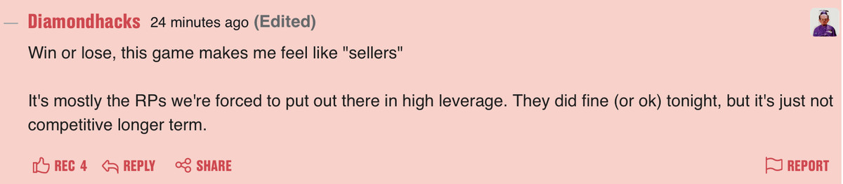 A light GDT tonight with a total of 195 comments at time of publishing. Only a few Sedona red comments, and Diamondhacks had two of them! I feel his observation here fits the tone and outcome of the game the best. Wish I could’ve picked Snake-Bitten’s wood chuckin’ Grichuk rhyme, though.