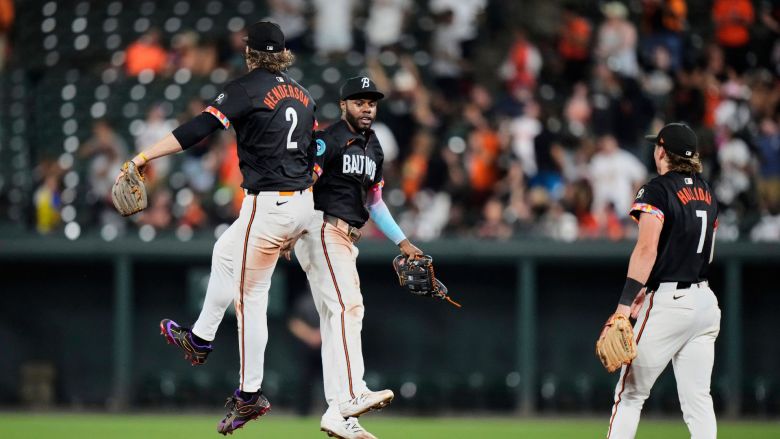 Baltimore Orioles center fielder Cedric Mullins (center), and shortstop Gunnar Henderson (2) celebrate their team’s victory over the Miami Marlins after a baseball game while Jackson Holliday (7) looks on. Credit: AP Photo/Stephanie Scarbrough