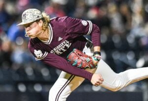 Mississippi State pitcher Khal Stephen (14) pitches against Ole Miss at Swayze Field in Oxford, Miss., on Friday, Apr. 12, 2024.
