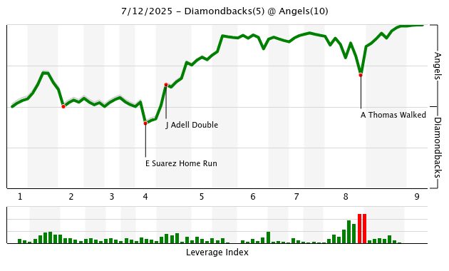 Well, Andrew Saalfank pitched two scoreless innings of relief, so that was kinda fun, but aside from seeing his rather remarkable curve ball in play again, that was mostly fun for the hilarious jokes about his bad gambling choices We also staged a rally in the top of the eighth, thanks to a Corbin Carroll double that was some serious hustle business, followed by a bunch of walks, a James McCann infield single and an Alek Thomas bases-loaded walk that allowed Suarez to score his third run of the game, that was all more due to meltdown wildness by the Angels bullpen. bringing the score to 6-5 LAA.