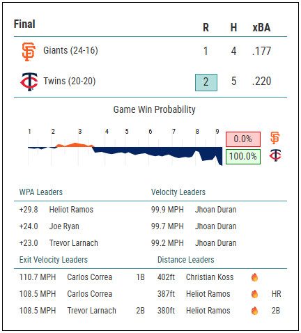 First, the credit to Joe Ryan. Still visibly ill — deep breathing, lying on the floor between innings, and none of his usual swagger on display in a major energy conservation effort — Ryan nevertheless turned in six innings of two-hit ball, walking none and surrendering the lone Giant score on a second-inning Heliot Ramos homer.