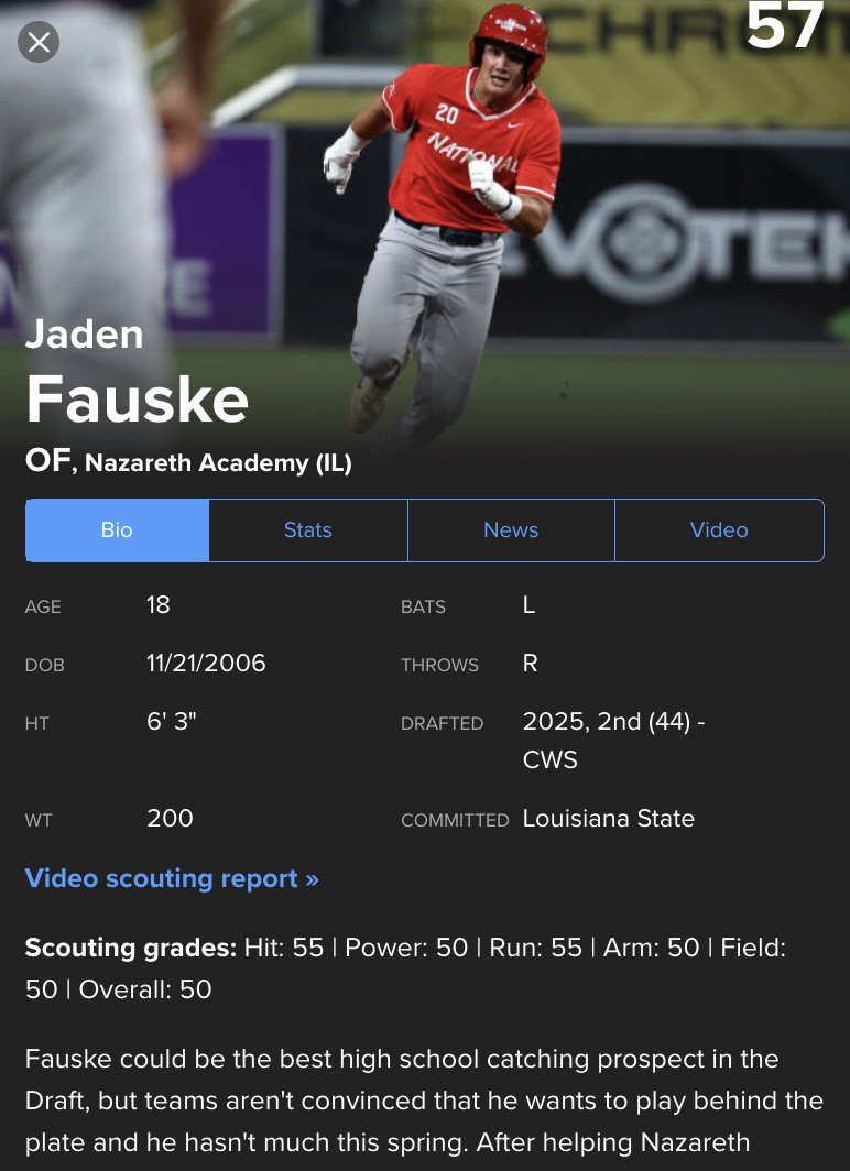 MLB had Fauske ranked as the No. 57 prospect in the draft, so not a massive cut in talent at this spot. Fauske is committed to play at Louisiana State in 2026, so it’s not known whether the White Sox will have to exceed the $2.22 million designated for this slot to sign him.