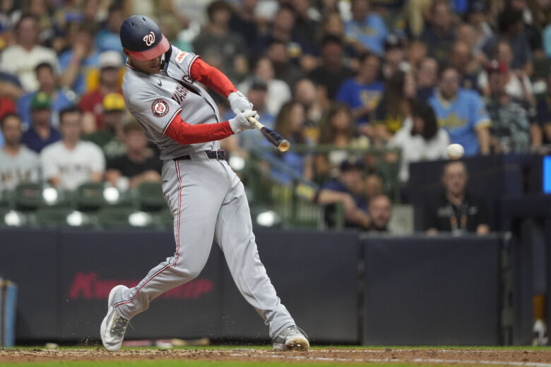 Washington Nationals’ Brady House hits an RBI double during the sixth inning of a baseball game against the Milwaukee Brewers, Friday, July 11, 2025, in Milwaukee. (AP Photo/Aaron Gash)(AP/Aaron Gash)