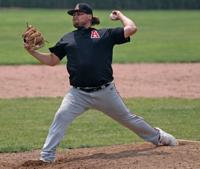 Utica’s Brock Wanninger gets ready to throw a pitch during the A’s 10-2 Home Talent Sunday League victory over Albion on Sunday, July 13, at Utica Field.
