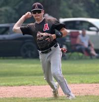 Utica’s Jacob Sanders makes a throw from third base during the A’s 10-2 Home Talent Sunday League victory over Albion on Sunday, July 13, at Utica Field.