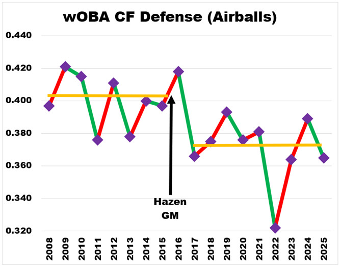 For the Diamondbacks, looking at air balls hit to centerfield, their wOBA improved about 8%. My view is that the improvement happened after Mike Hazen became GM.