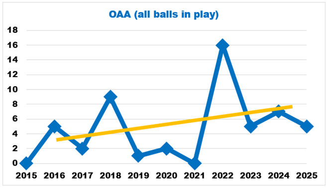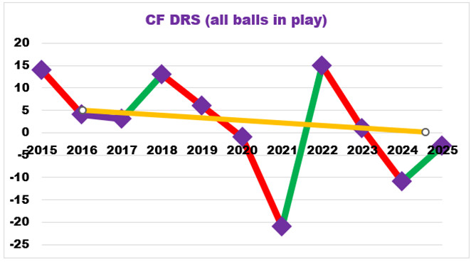 For 2015 to 2025, looking at all balls in play hit to centerfield, the Diamondbacks’ Defensive Runs Saved (DRS) slipped toward league average, while their Outs Above Average (OAA) improved to significantly better than league average. For details see following two graphs. The two gold lines show the trends.