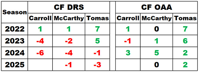Sometimes, a centerfielder’s DRS and OAA may seem to be contradictory. For example, in 2024 three centerfielders (Corbin Carroll, Jake McCarthy, and Alek Thomas) had positive OAAs and negative DRSs. For details, wee the following table.