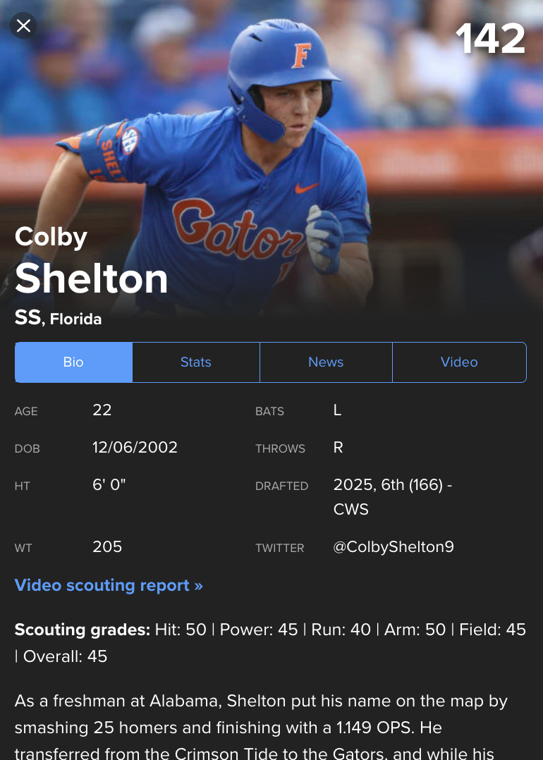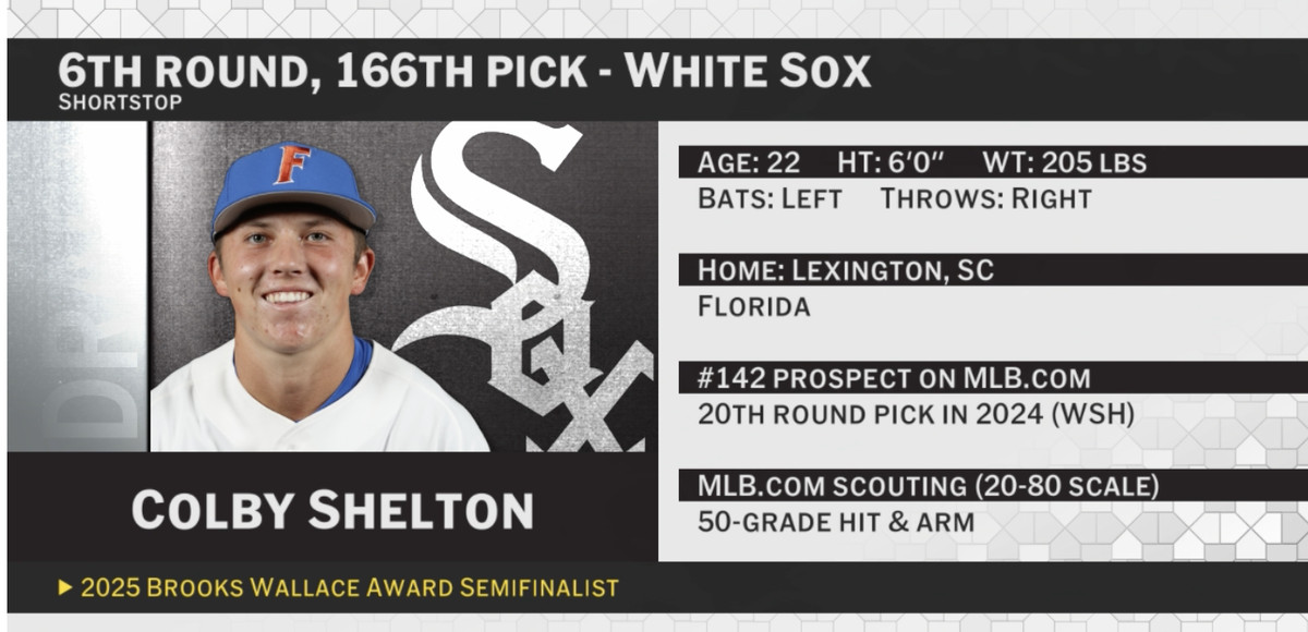 Shelton started out his college career with massive home-run power, then shifted his swing to incorporate a better plate approach, figuring that as a better path to the pros. The switch did elevate him from a 20th Round flier in 2024 (he was picked by the Nats, but did not sign) to the sixth round in a hitter-hungry org in Chicago.