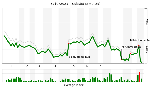 The Mets did finally get another clutch hit in the bottom of the frame, once again coming from—of all people—Brett Baty. With two outs and a runner on first (from a one-out single from Vientos), Baty hit his second home run of the game—this one an impressive opposite field shot—and just like that it was once again a one-run game heading into the ninth. With it once again being a close game, Mendoza turned to closer Edwin Díaz for the ninth, and he tossed a sparkling 1-2-3 inning to give the Mets a chance to complete the comeback with their last licks. Porter Hodge came on to try to secure the save, and the Cubs—for approximately the millionth time tonight—allowed the tying run to reach base, as Jeff McNeil led off the inning with a pinch-hit walk ahead of the top of the order. But—for approximately the millionth time tonight—the non-Brett Baty hitters in the lineup failed to come through in the clutch, as Lindor hit a soft grounder back to the pitcher that the Cubs turned for a double play, and Soto followed with a weak ground ball to second to end the game.