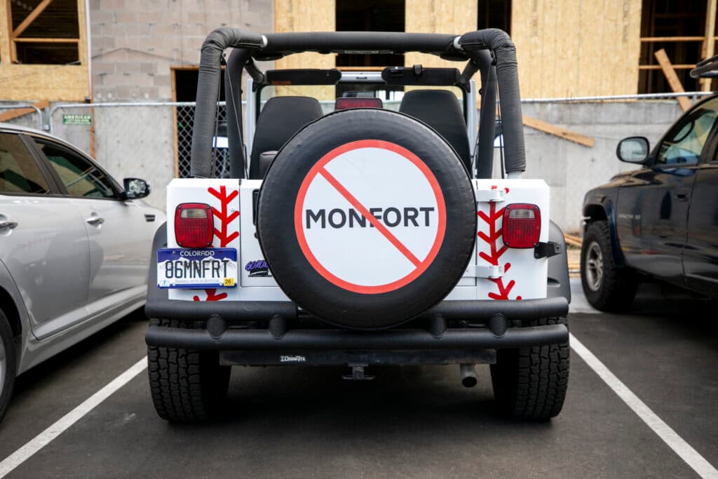 Kevin J. Beaty/DenveriteThis baseball-wrapped Jeep also expresses discontent for the Colorado Rockies’ ownership. July 9, 2025.