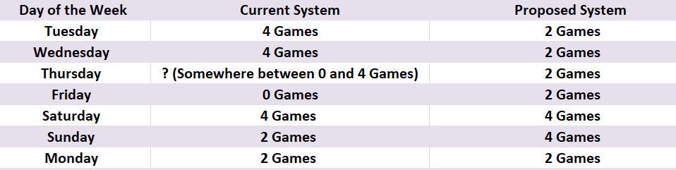 For the overall comparison, here’s the current system vs. the proposed system in terms of how many games would be played each day. Draw your own conclusions as to which is better.