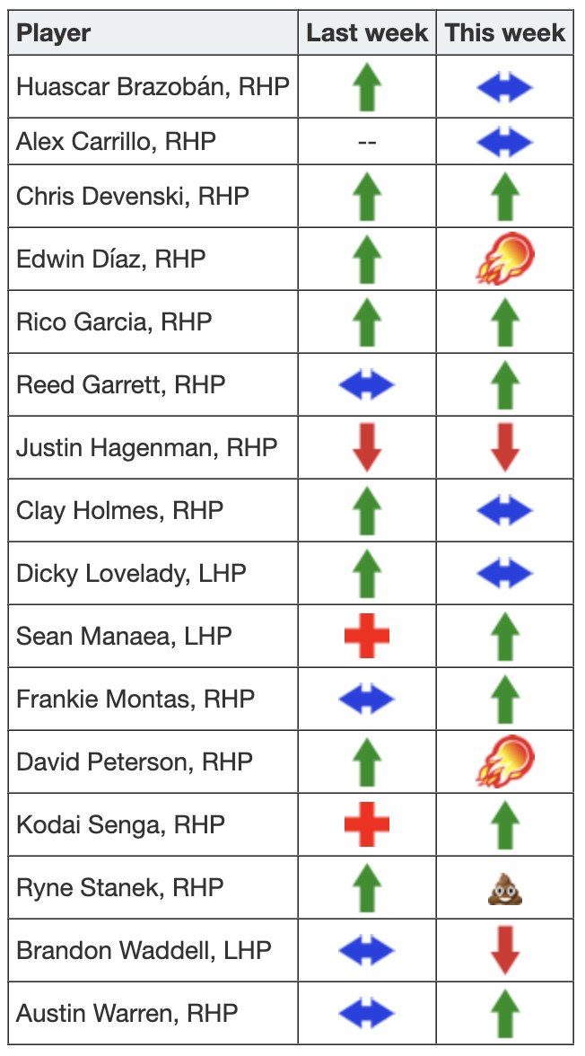 Reed Garrett had a clean sheet this week across three appearances. He worked around a walk and a hit to pitch a scoreless eighth inning in Tuesday’s game, which proved to be vital for the Mets’ comeback. He then earned his 15th hold of the season for a scoreless eighth inning on Friday after the Mets tied it up. He then finished off his week by earning yet another hold on Sunday for a 1-2-3 sixth inning.