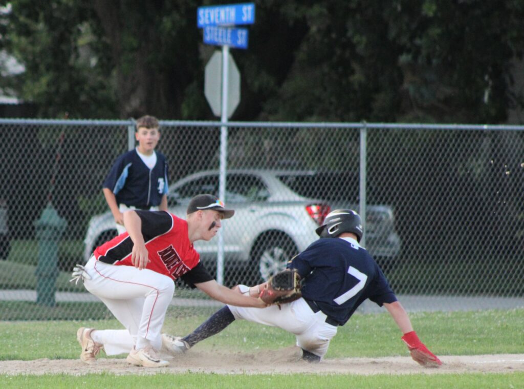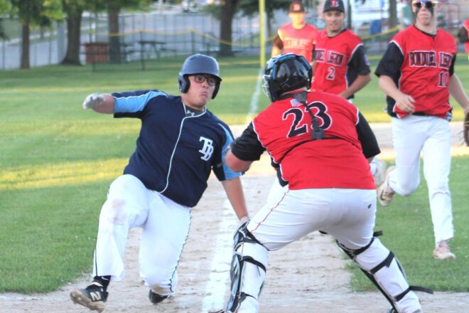 Ahnapee’s Jacob Massey (left) is tagged out sliding into home by Bonduel catcher Kody Schoeder (23) during Thursday’s American Legion baseball game at Algoma’s Perry Field. Photo by Kevin Boneske.