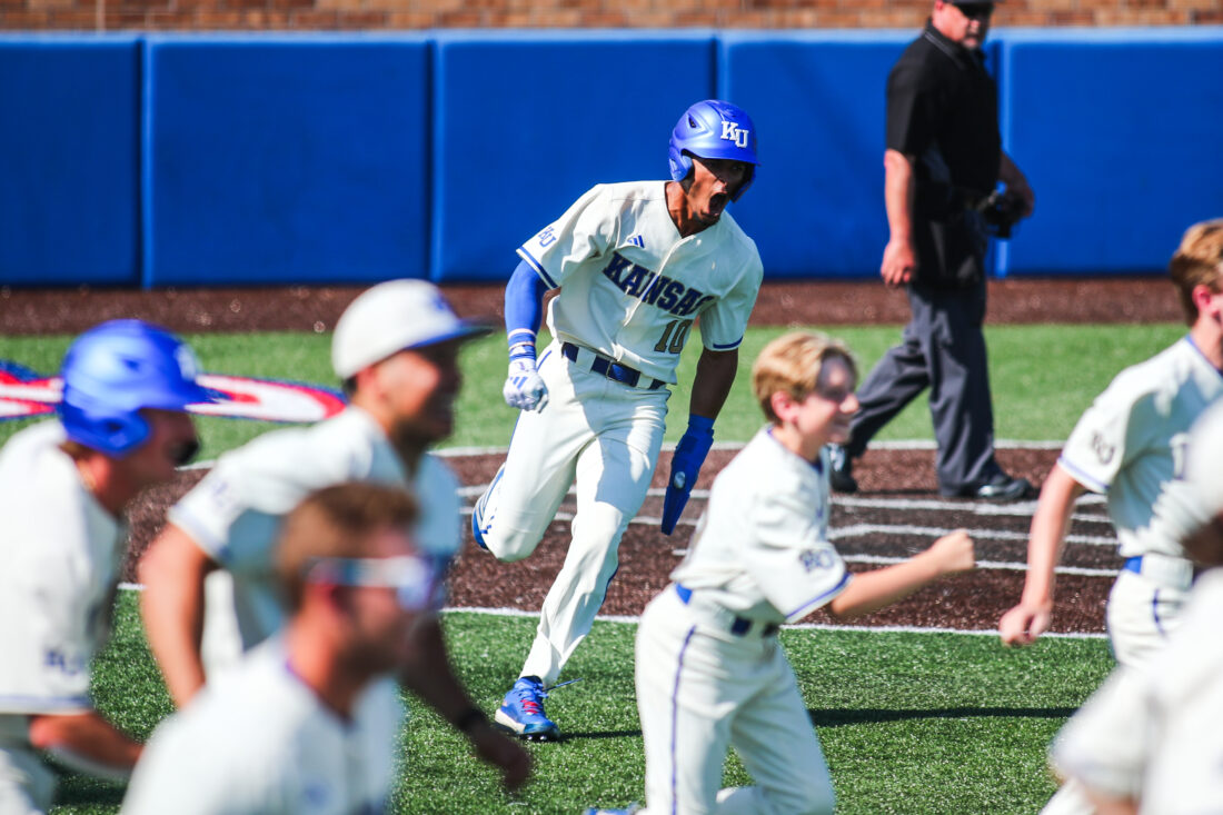 Kansas outfielder Derek Cerda celebrates after scoring the winning run on a walk-off single by Mike Koszewski against BYU on Saturday, May 10, 2025, at Hoglund Ballpark.