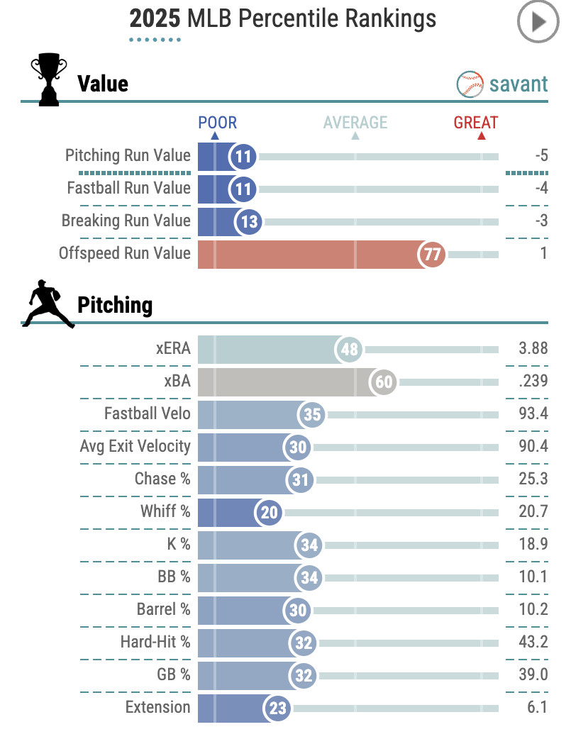 The righthander is 2-3 on the season with a 4.26 ERA and 1.45 WHIP. Free passes continue to plague him, with a 4.03 BB/9, which is a significant increase from the 2.90 he had last year. However, his 7.58 K/9 is solid and has improved by a point from 2024’s 6.59. Here’s a look at how he’s profiling overall.