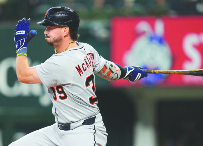 The Detroit Tigers’ Zach McKinstry follows through on a groundout in the second inning against the Texas Rangers on Saturday in Arlington, Texas. (AP photo)