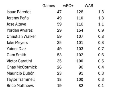 This seems consistent with Pena and Paredes returning around the end of July or early August, with Meyers and Alvarez returning near the end of August or in early September. This involves a lot of uncertainty, but the injury return dates don’t seem unreasonable. Once the lineup progresses as more injured players return, the Astros’ wRC+ and WAR over the remainder of the season is projected to be fairly productive.