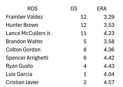 The depth chart projects that Luis Garcia and Christian Javier will make three starts between them. The depth chart also assumes that the two returning pitchers will have 12 appearances out of the bullpen between them. Arrighetti is assumed to return earlier than Javier and Garcia and start 6 games. The projections view Valdez, Brown, and Walter as the above average starters in the rotation. The projection for McCullers seems optimistic to me. However, if Lance is unable to starter 11 games this year, Walter and Gordon would probably increase their expected number of starts.