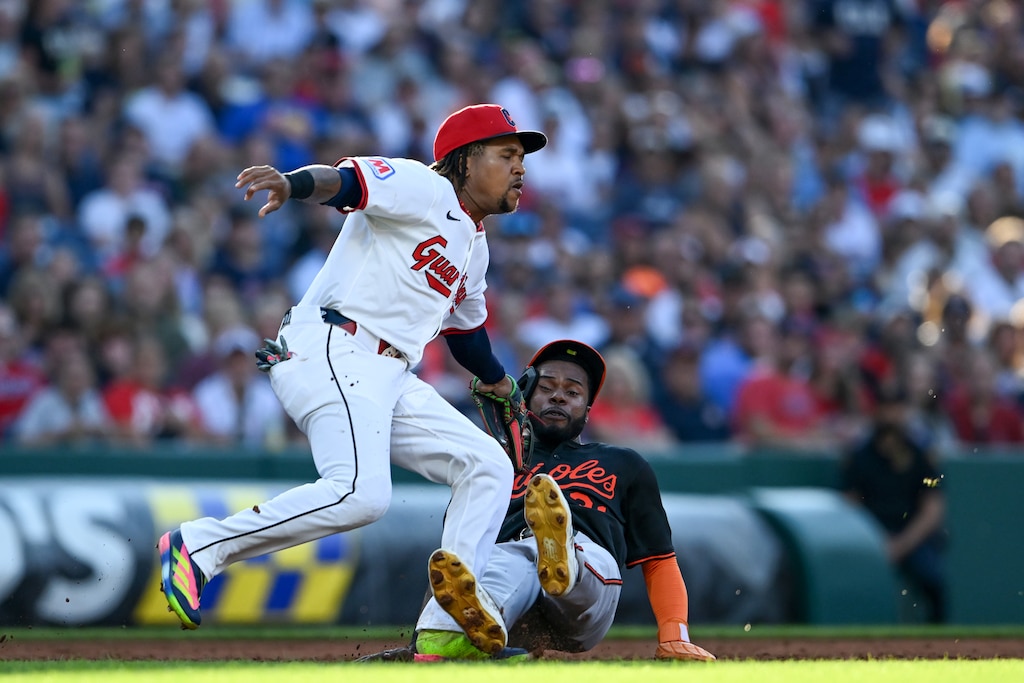 José Ramírez of the Guardians tags out Cedric Mullins after a rundown in the third inning. (Nick Cammett/Getty Images)