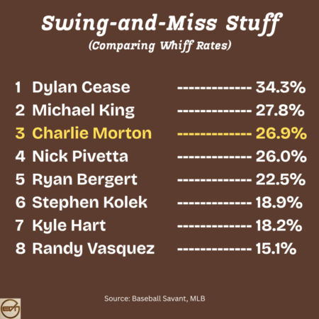 When compared to Padres starters with a minimum of six starts, Morton’s 26.9% whiff rate ranked third among eight pitchers who meet this criteria, only trailing Michael King and Dylan Cease.