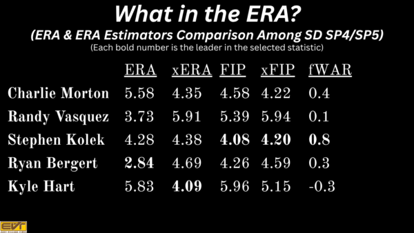 Furthermore, his batted ball numbers show signs of upcoming positive regression to the mean. Morton has a .331 BABIP against him this season, whereas the league average is around .300, and his 69.6% LOB% is below the league average of 72%. ERA estimators, such as xERA, FIP, and xFIP, all indicate that he is pitching better than his ERA. When looking at the back end of the Padres’ rotation and comparing Morton’s numbers, he grades out rather well.