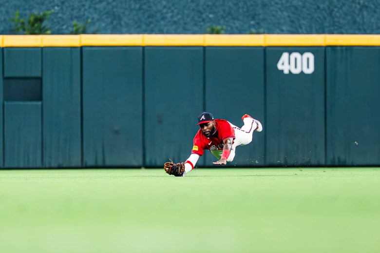 Michael Harris II (above), Atlanta Braves center fielder, makes a catch during the eighth inning against the Philadelphia Phillies at Truist Park on April 10, 2025. Matthew Grimes Jr./Atlanta Braves
