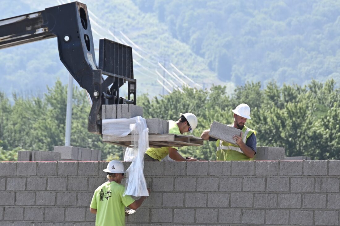 Workers from Seachrist Masonry lay a block wall for a structure at the Lumber Yards in Williamsport on Friday, July 25, 2025. The 28-acre facility off Maynard Street will include six lighted, synthetic turf fields for youth baseball and softball along with one 400 foot collegiate field.
