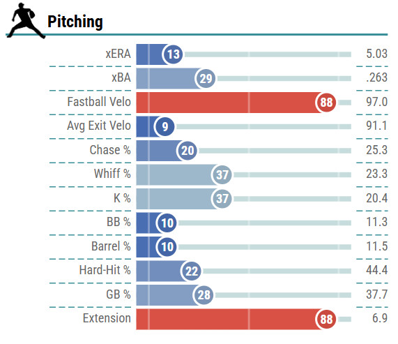 Moving on to Jack Leiter, he’s been … well not very good, either. The highly-touted prospect and former second overall pick has settled in as a not-very-good starter. His walk rate is just a tad south of 8 per 9, and his walk rate is solidly above 4 per 9. Aaand he doesn’t get a lot of groundballs, which means his expected metrics are all near 5.