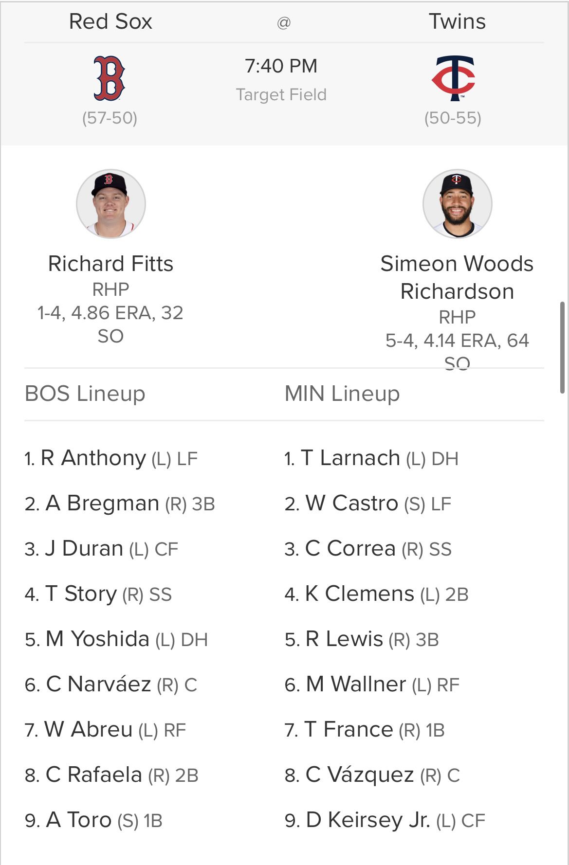 The Sox are lookin’ to keep the good vibes going as they head to Minnesota to face Simeon Woods Richardson and the Twins behind Richard Fitts (7:40 p.m., NESN).