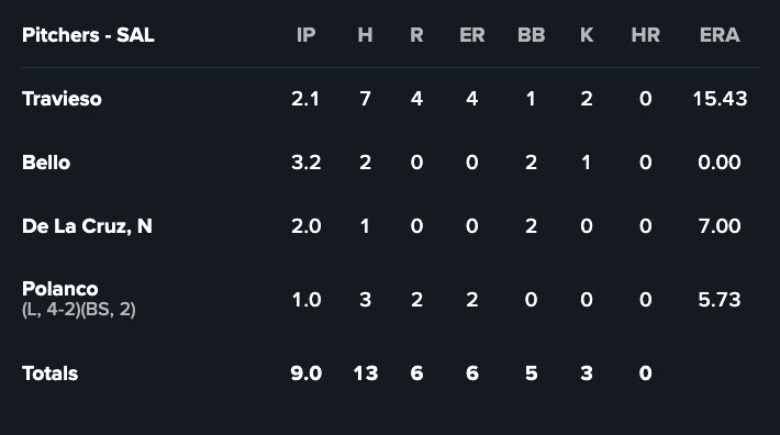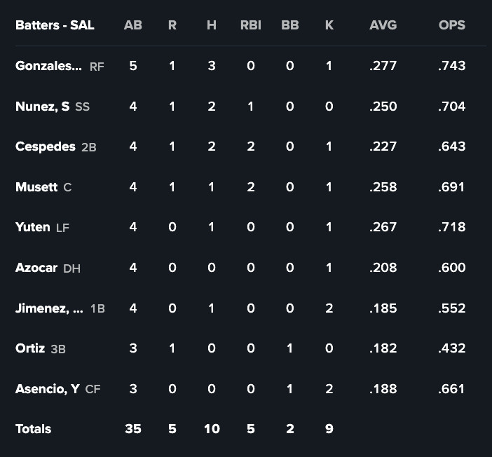 Salem gave up thirteen hits to the RiverDogs (Rays A) and had to pull their starter in the third inning. Jose Bello pitched a solid 3 2⁄3 following that and was perhaps the only defensive reason this team even came close to winning on Sunday afternoon. Meanwhile, the usual Salem suspects were rocking at the plate. Justyn Gonzales went 3-for-5 and Starlyn Nunez chipped in with a double, improving his already-solid .300 July batting average.