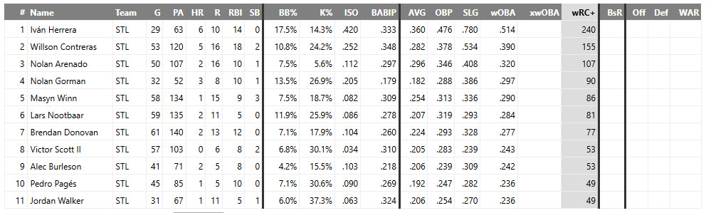 For the love of God, please get an offensive piece who can hit LHP. Ivan Herrera cannot do it all for the Cardinals, they need more. Here is breakdown of the Cardinals hitters against LHP this season minimum 50 PA’s: