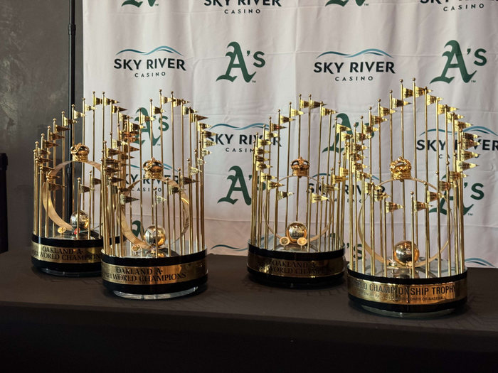 The A’s four World Series trophies were on display at 32 Brews Street within the Sky River Casino, located at 1 Sky River Parkway in Elk Grove on July 24.