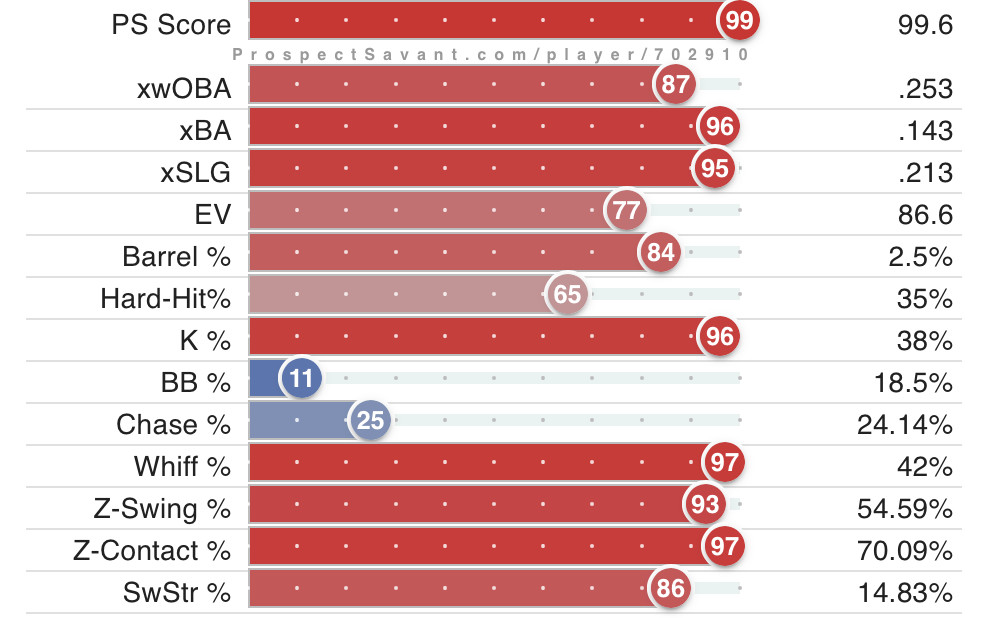 While it’s easy to discredit the advancements because the walk rate is still a bit high, it’s important to point out that, that is primarily the only way players are getting on base against him now. He has now appeared in 20 games as a reliever, of which 11 of them he did not give up a single hit. If you take a look at the recently created Prospect Savant (www.prospectsavant.com), that only takes into account data from Triple-A,