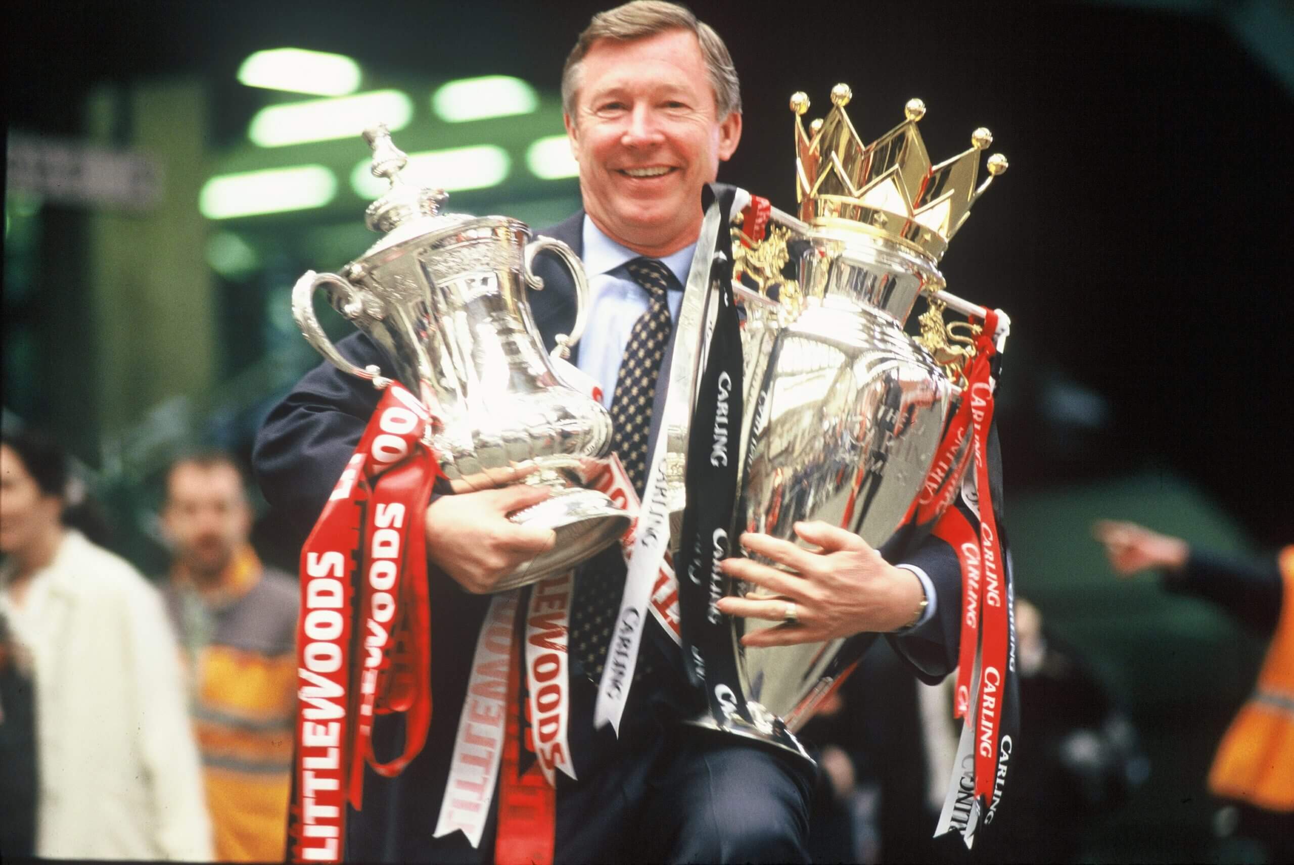 Ferguson holding the FA Cup and Premiership trophies after completing the Double with United in 1997 (John Peters/Manchester United via Getty Images)