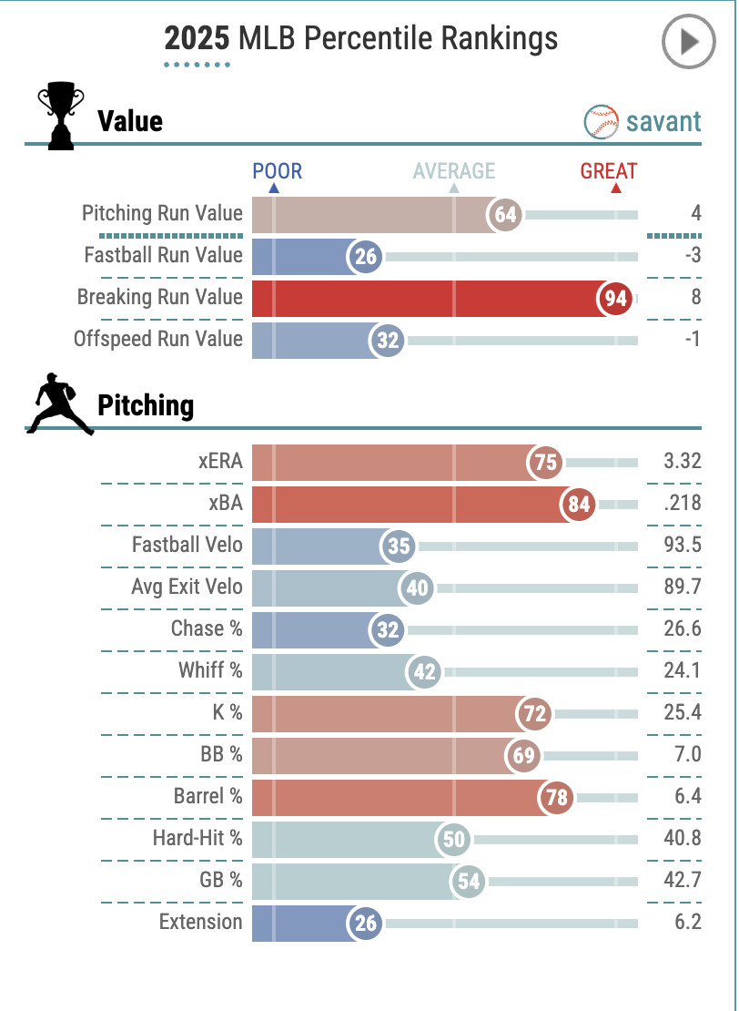 So that xERA and xBA are pretty darn good. Seems like something that is promising with a better Cubs defense behind him. The breaking ball values are also quite good and the fastball value isn’t. I don’t know if the Cubs plan on having him throw his slurve and sinker more and his four-seamer less, but I certainly believe that they are considering it.