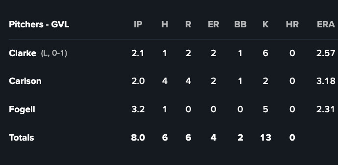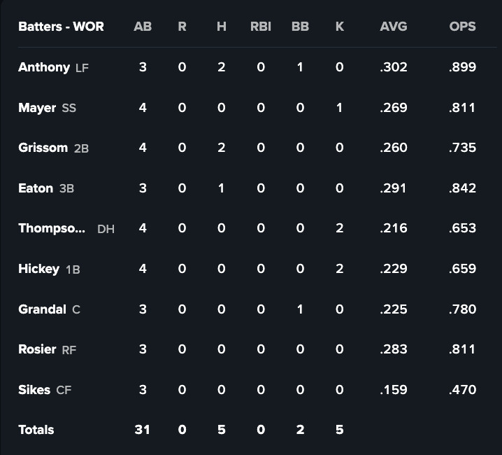 Nazzan Zanetello is an intriguing and frustrating prospect. He has impressive power, extremely impressive speed, notable arm strength, and all the makings of a five-tool prospect, but he’s just had such a slow start to his career and needs to shorten his swing up, as he’s continued his offensive woes. So, too, did the rest of Greenville’s lineup Sunday. Despite Brandon Clarke having a short but good outing, striking out seven of the nine batters he faced, and the rest of the staff totaling thirteen strikeouts against the Emperors (Braves High-A), the 2-through-4 spots alone struck out seven times. Franklin Arias continues to gather hits, though, as he’s found his swing in High-A. It’s just unfortunate Greenville wasn’t able to gather any runs and fell by the same score as Worcester.