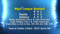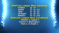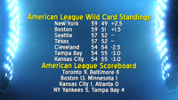 Texas and Seattle are tied for the final A-L Wild Card spot. Boston beat Minnesota 13-1. The Yankees edged Tampa Bay 5-4 and hold a 2-and-a-half game lead for the top Wild Card playoff spot. Cleveland trails Seattle and Texas by 2-and-a-half games for the final Wild Card spot. The Rays and Royals are tied 3-games back.