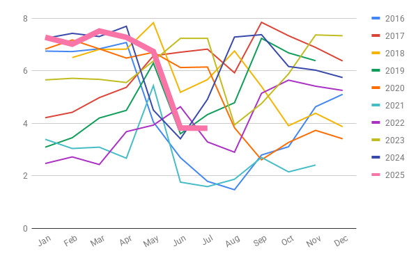 Ok, I guess it’s technically not August yet, but the trade deadline officially passed this afternoon, and the team are off today, so there’s no game to make a difference there. On the heels of a brutal July (9-16), the team were sellers for the first time since the 2022 campaign. In terms of volume, it certainly ranks in the biggest sell-offs in franchise history, though perhaps more due to expiring contracts rather than the team’s record. Of the 28 full seasons played by Arizona, there have been nine where the D=backs have had fewer wins through 109 games than they do this year. But this might be an interesting test of short- vs. long-term confidence. Did the team get worse in 2025, for a better 2026?