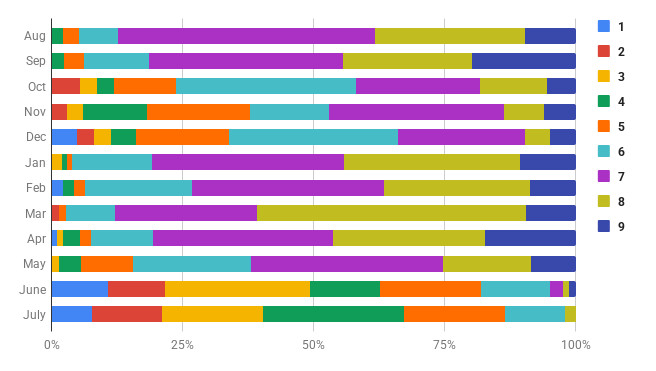 Compared to last month, there was a general solidifying of opinion towards the middle, though not to an enormous degree. At the start of May, almost half of all votes were at “3” or below. A month later, that number has decreased some what to 40%. But the same goes at the top end, where the percentage who were “6” or higher declined from 18% to 13%. No prizes for guessing where they went: to the “4” and “5” categories, with the former more than doubling from 13% at the start of May, to 27%. However, the overall impact basically canceled each other out, with the average showing the smallest change possible, declining from 3.82 to 3.81, as fans were clearly unconvinced, the team hovering around .500.
