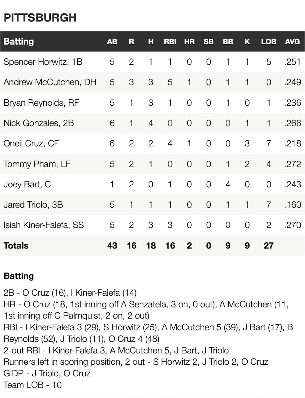 Everyone in the Pirates’ lineup had at least one hit, aside from Joey Bart, who reached base five times and finished with four walks, becoming the first Pirates catcher since Ryan Doumit in 2007 to accomplish the latter feat. Nick Gonzales finished with four of the Pirates’ 18 hits. Andrew McCutchen had three hits and drove in five runs, while Bryan Reynolds and Isiah Kiner-Falefa also contributed with three-hit efforts. Oneil Cruz had two hits, including a first-inning grand slam.