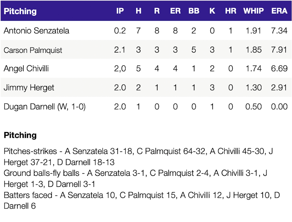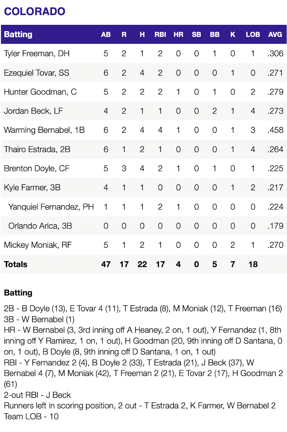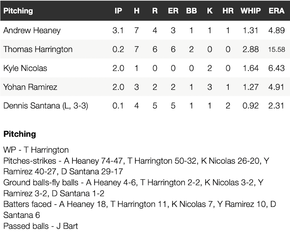 Major League Baseball’s worst team scored five runs off Dennis Santana in the ninth inning, capped by two on a walk-off home run by Brenton Doyle, and seven runs over the final two innings. They became the first team in history to allow 15-plus runs, allow a nine-run inning and face a nine-run deficit and still win the same game. Andrew Heaney allowed four runs (three earned) over 3 1/3 innings before Thomas Harrington allowed six runs on seven hits in 2/3 of an inning, Yohan Ramirez two runs in two innings.
